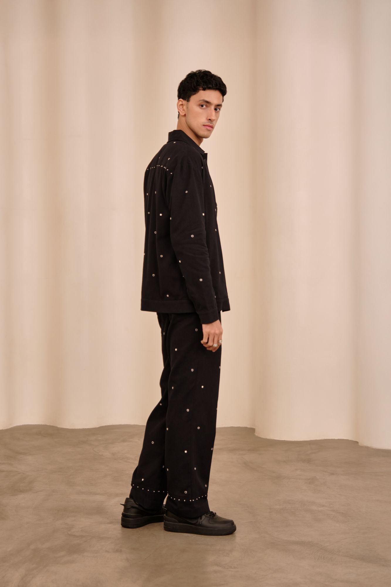 open collar - front button closure - all over geometric embroidery - horizontal back pleat detail with French knots - wide cuff - relaxed fit - fully lined