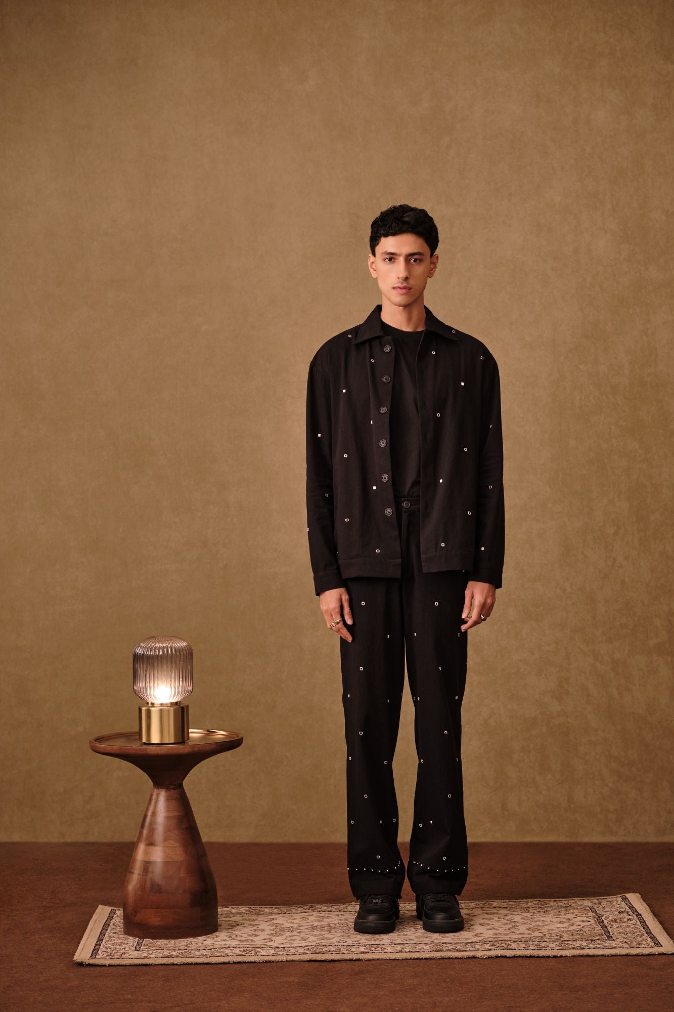 front button closure - all over geometric embroidery - relaxed fit - regular pant waist - straight fit
