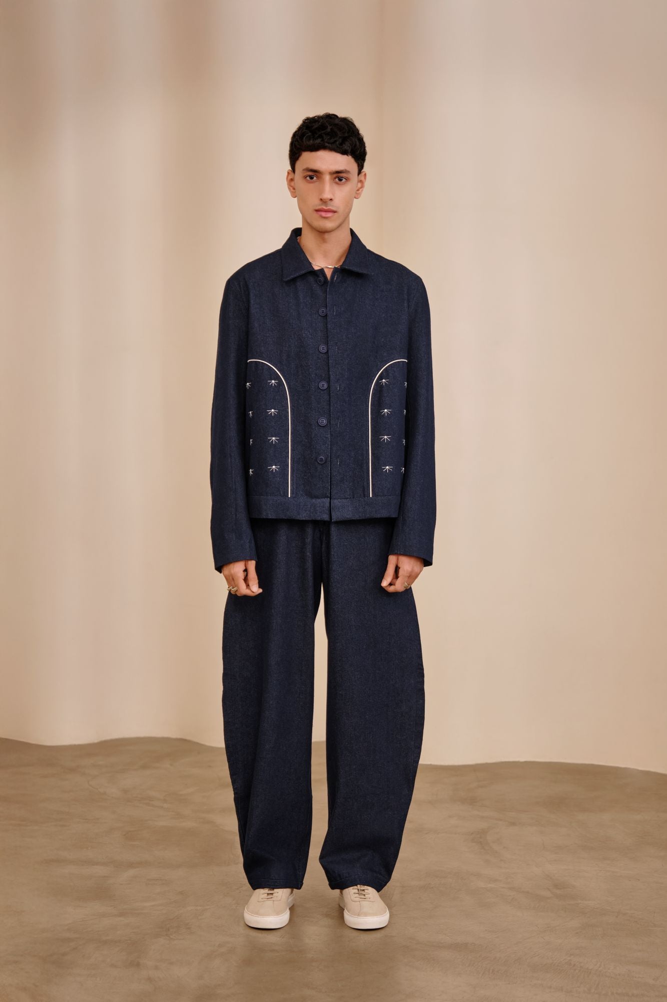 front button closure - shoulder drop - contrast piping detail - hand embroidery detail - oversized fit - regular pant waist - circular pant leg - relaxed fit