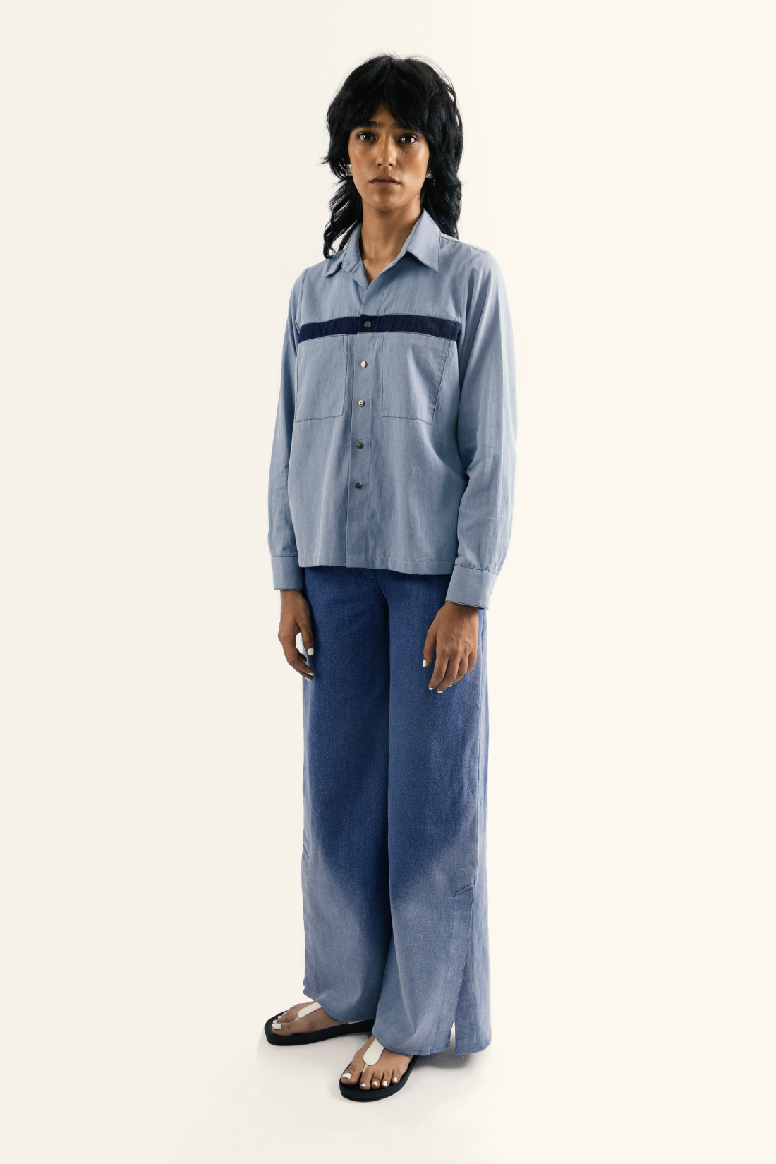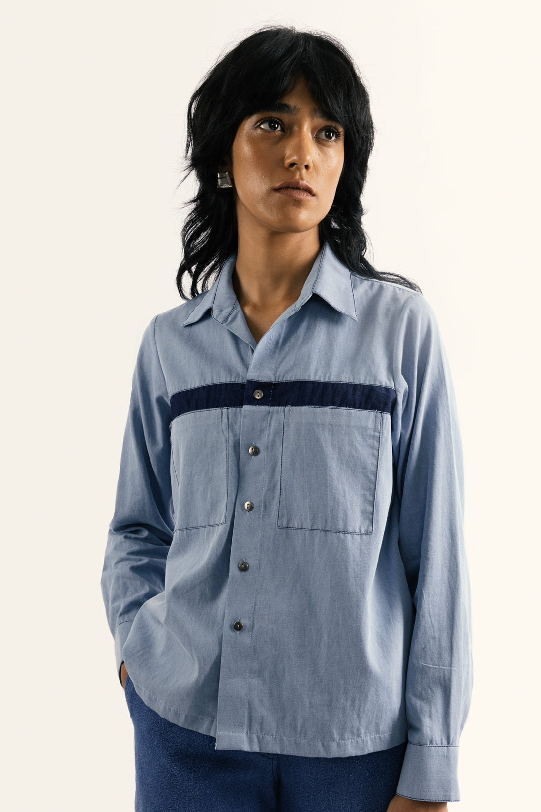 regular shirt collar - contrast panel - front patch pockets - contrast top stitch detail - full sleeve - boxy fit - cropped length