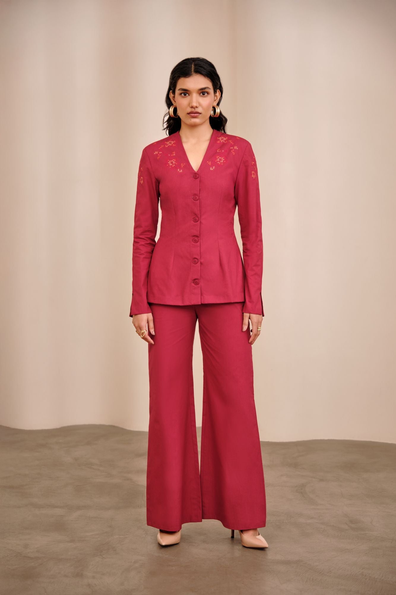 v neck - front button closure - shoulder pads - fitted on waist - button closure - hand embroidery detail on shoulders - sleeve slit detail