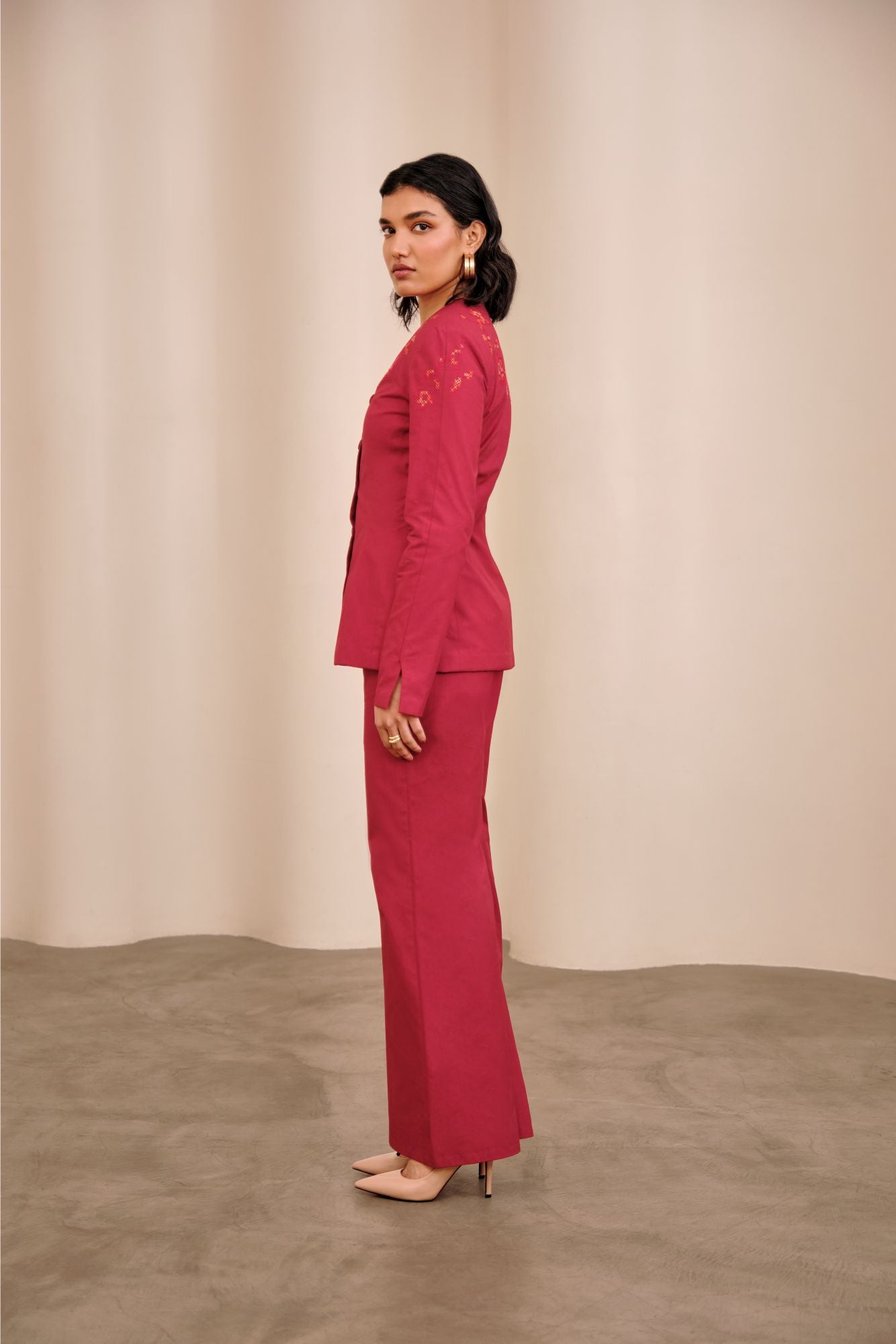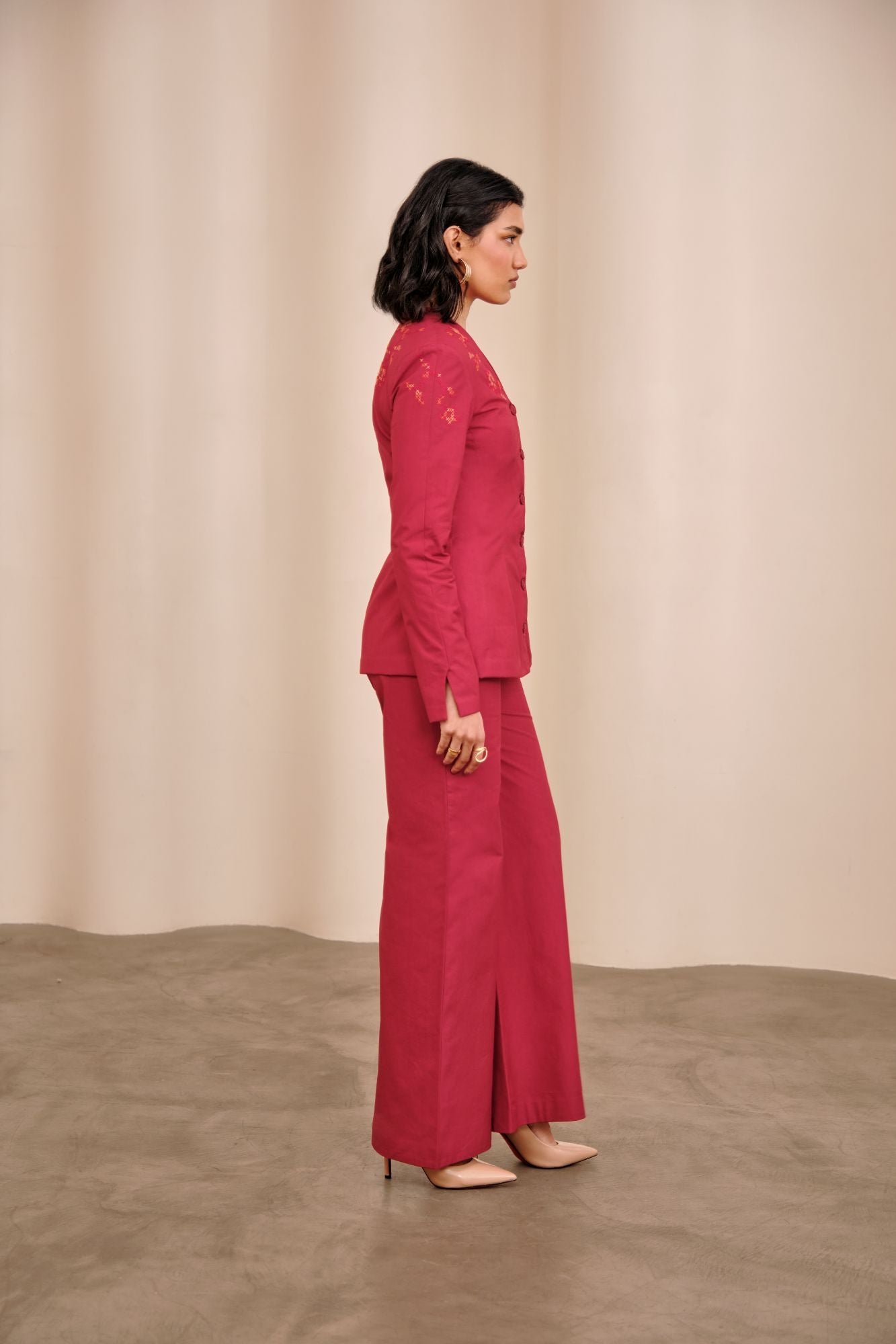 v neck - front button closure - shoulder pads - fitted on waist - sleeve slit detail - high waisted pants - boot legged fit