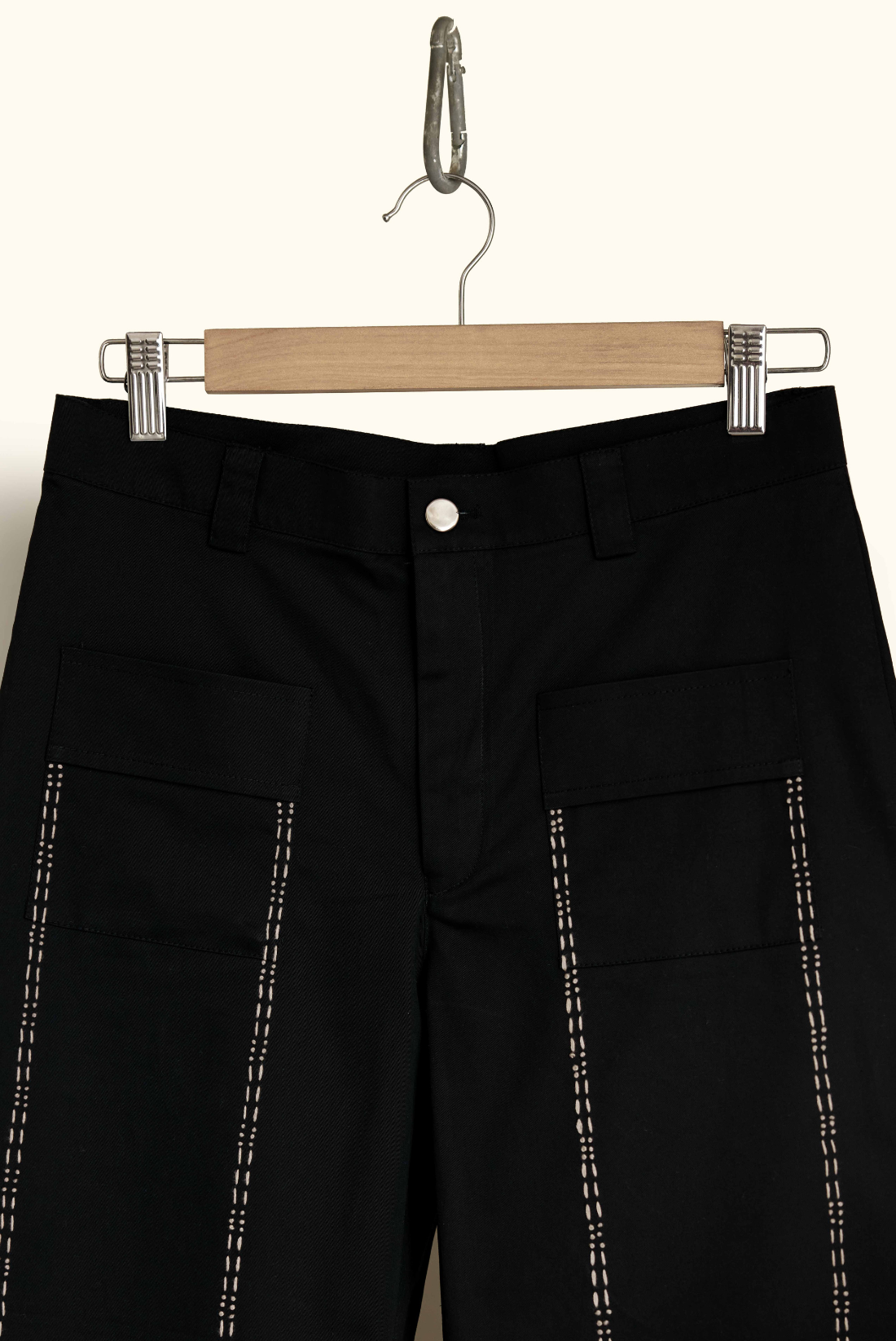 mid rise - front and back patch pocket - cotton thread hand embroidery detail - straight legged - relaxed fit - fly front zip closure