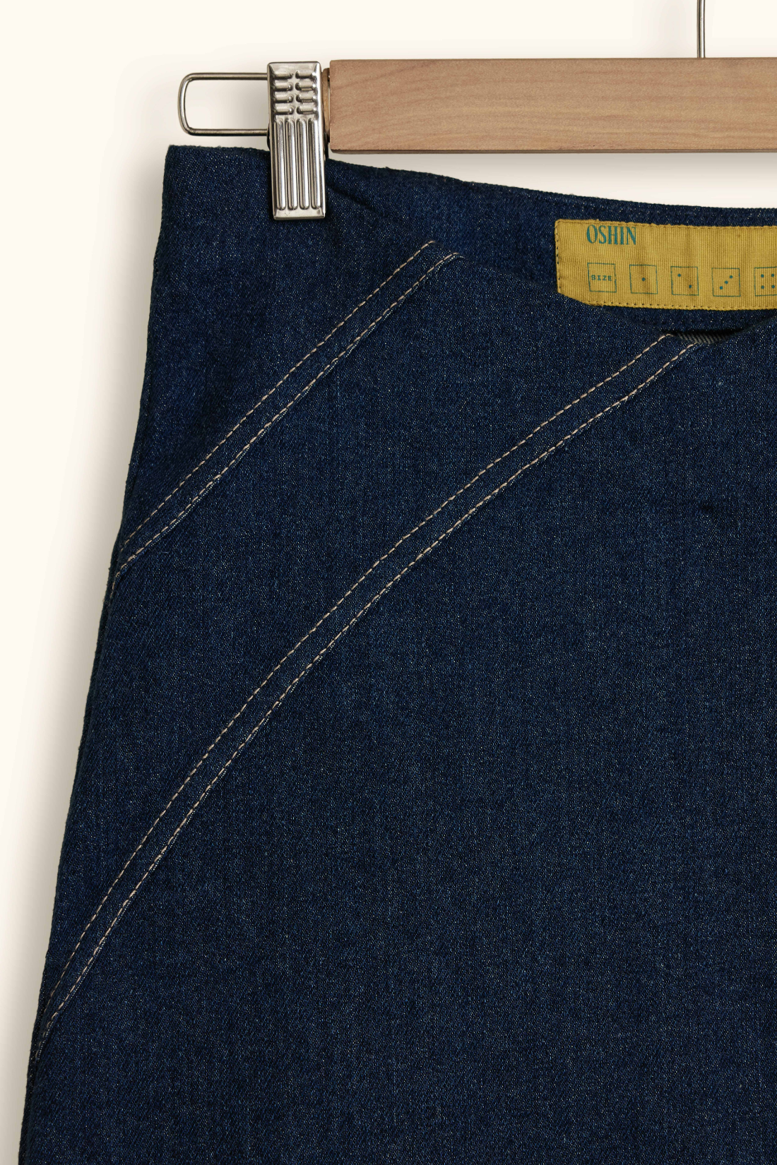 v-shaped waistline - felt seam detail - front diagonal slit - contrast top stitch detail - conceal side zip closure